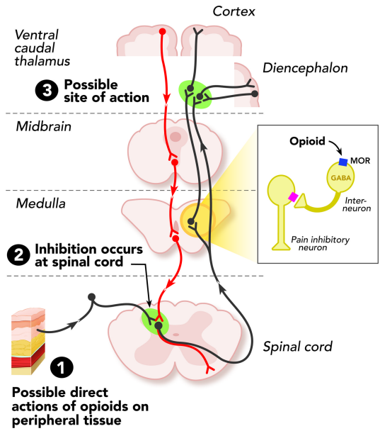 阿片受體在這些部位的激活位置直接抑制神經(jīng)元,進(jìn)而抑制脊髓疼痛的傳遞。這些受體參與去抑制的過(guò)程傳導至神經(jīng)元將有害刺激轉化為動(dòng)作電位并傳導到脊髓。從傷害感受器傳遞信息到上升的脊髓神經(jīng)元,然后再到大腦通過(guò)單突觸接觸和/或通過(guò)中間神經(jīng)元進(jìn)行調節。被激動(dòng)劑激活后,如內源性μ-阿片肽(Endorphin),或外源性激動(dòng)劑如嗎啡(Morphine)和芬太尼(Fentanyl)的Gα和Gβγ亞基彼此分離并隨后作用于各種細胞內效應物通路。